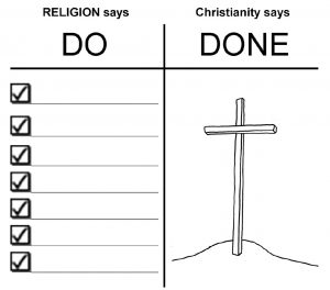 The difference between Religion and being a Christ Follower is that a religious person is trusting in themselves and all the things they do to be counted worthy, but a Christ Follower is trusting only in Christ’s perfect work on the cross as their way to the Father. The Bible says, Christ did all you need for Eternal Life. If we could do this ourselves by following a list of rules and being a good person, Christ didn’t need to come and especially did not need to die. He did everything necessary for you to have Eternal Life!
